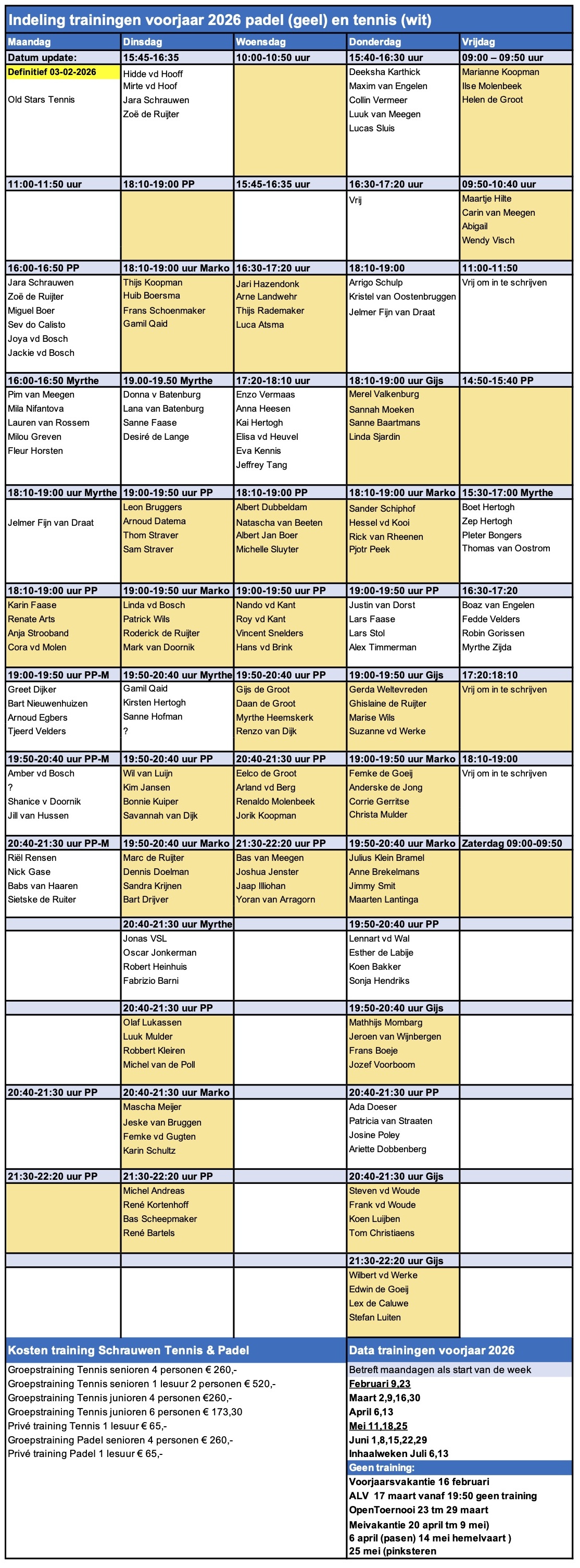 Indeling trainingen voorjaar 2026