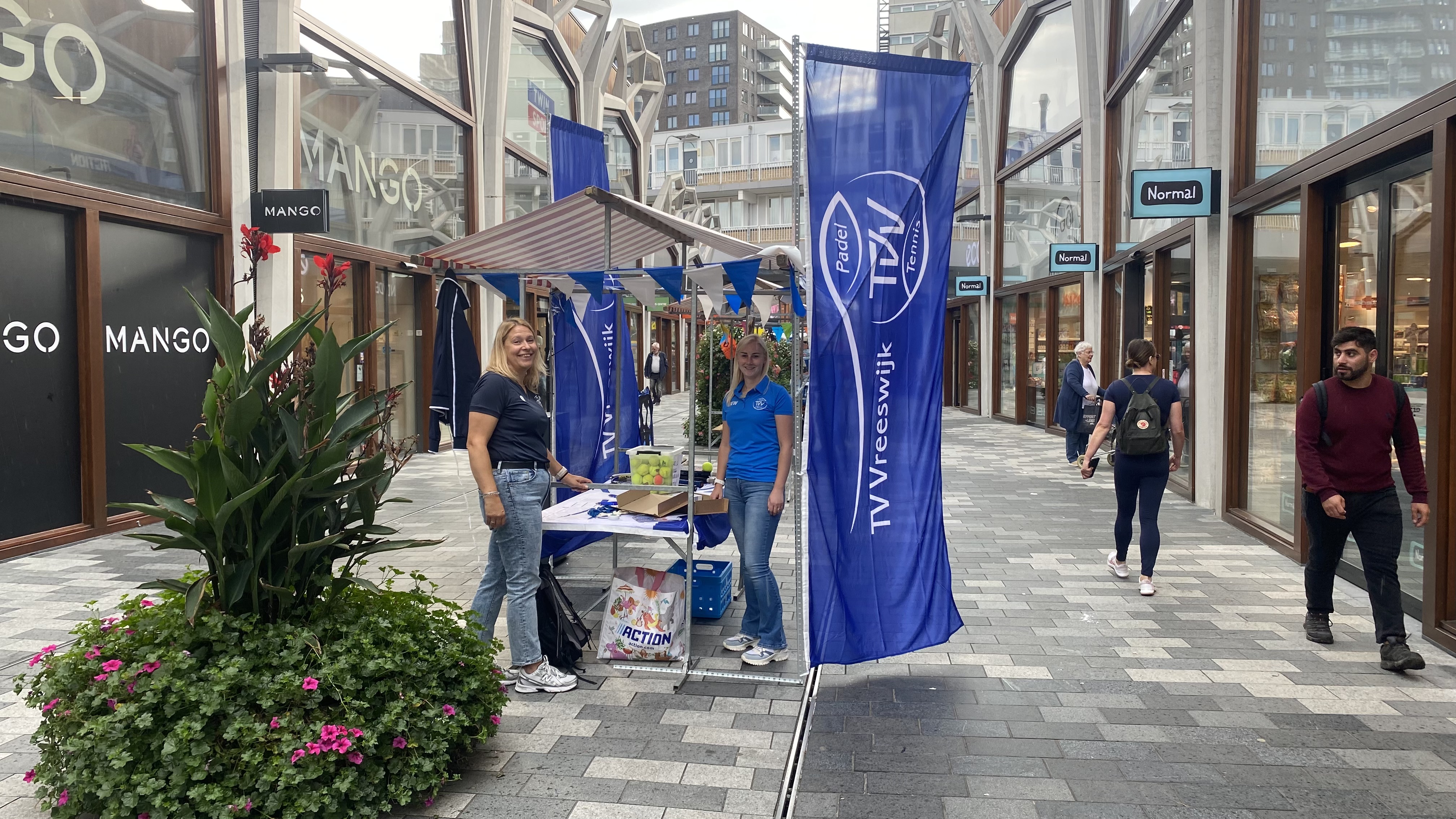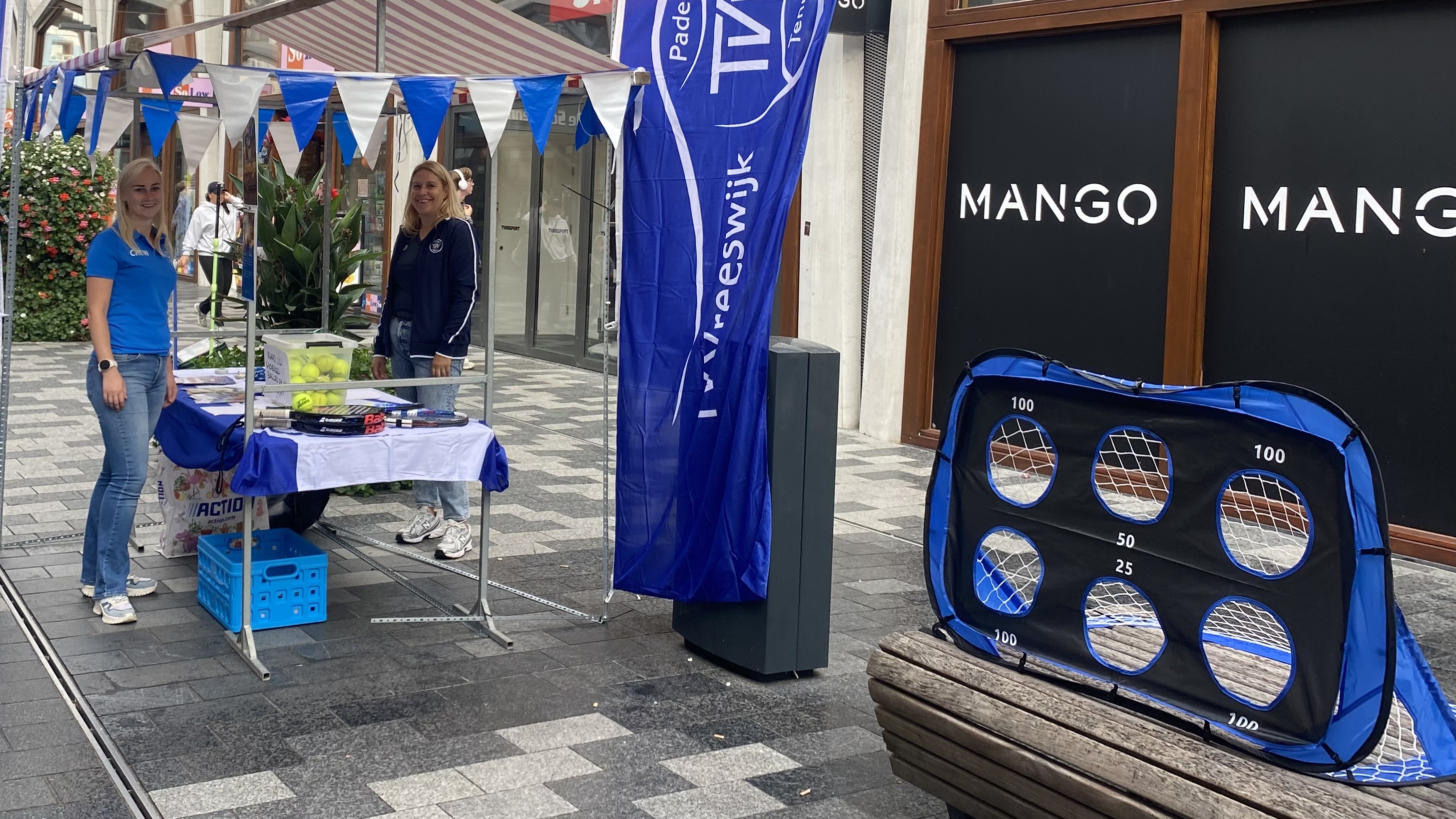 Met een sfeervol aangeklede kraam hebben Manon Warrink en Femke de Goeij onze club gepresenteerd aan bezoekers van alle leeftijden. Zij deelden flyers uit aan geïnteresseerden in tennis en padel, en gingen in gesprek met potentiële nieuwe leden.